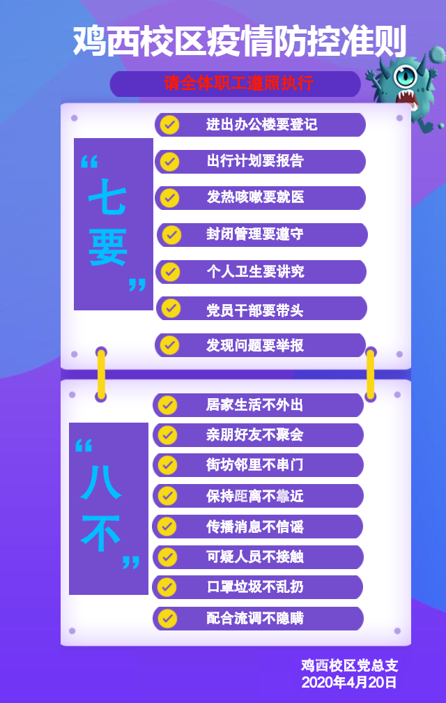 为了应对疫情防控新形势,落实学校4月19日“党委常委会暨应对疫情工作领导小组会议”要求,鸡西校区党总支4月20日上午召开班子会议,制定《鸡西校区疫情防控准则》(“七要八不”)如下,请全体职工遵照执行。
