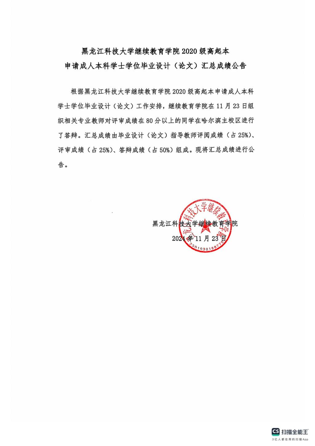 太阳成集团tyc151cc2020级高起本申请成人本科学士学位毕业设计(论文)汇总成绩公告