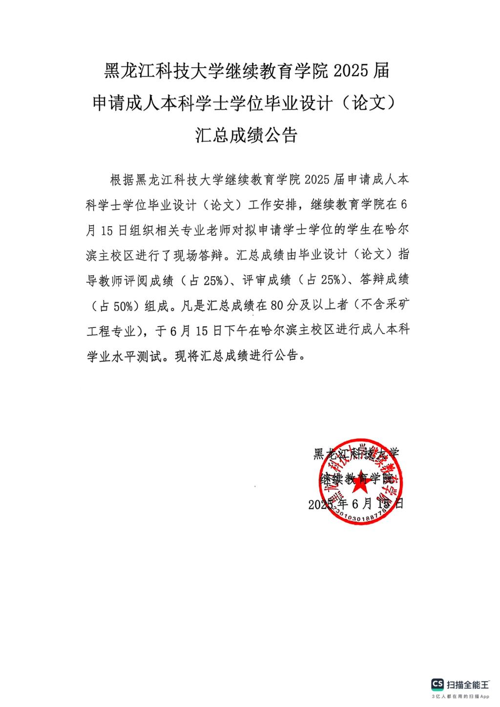 太阳成集团tyc151cc2025届申请成人本科学士学位毕业设计(论文)汇总成绩公告